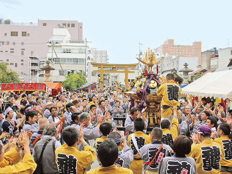 福島市の総鎮守「福島稲荷神社」の秋の例大祭。10月11日(土)の例大祭の神事を皮切りに、12日(日)は本社神輿が氏子36町会を渡御。夕方には祭りの見どころの一つである「連山車」が福島駅前から神社までを巡行する。