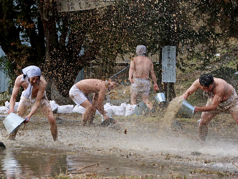 水がなくなると、泥水までかけ合うことから「泥かけまつり」とも呼ばれている。一年の平穏を願った迫力ある行事を見に行こう。