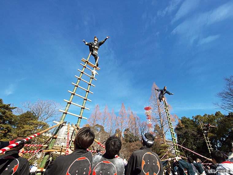 一年の無火災、無災害を祈念し、毎年1月初旬に行われるいわき市の消防出初式。出初式の際に、いわき市消防団はしご乗り行事保存会による「はしご乗り」が披露され、太夫が高さ5.5mのはしごに登り、威勢の良い掛け声とともに「遠見」や「しゃちほこ」などの演技を見せてくれる。