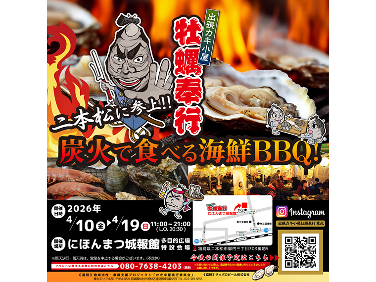 産地直送のカキを屋外の特設会場で味わえる“出張カキ小屋”『牡蠣奉行』が、二本松市に参上!鮮度抜群の殻付きカキ(一盛り880円)をはじめ、ツブ貝、ホタテ、赤エビ、サザエなどの海産物(350円〜)を、会場に設置したバーベキューコンロで焼きながら食べられる。