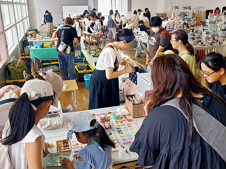 アクセサリーやキーホルダー、編み物、ドール服などの多彩なハンドメイド雑貨に加え、ホイップデコやネイルチップ、手形足形アートのワークショップなども楽しめる。