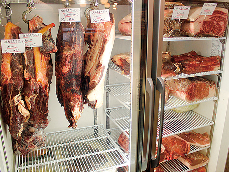 と意気揚々と入店するやいなや目を引く熟成庫。「温度」「湿度」「微生物」を厳密に管理しているのだとか。肉は低脂肪の福島県産牛やエゴマ豚。寝かせることで肉の旨み成分が倍増し、肉質もやわらかく変化。1ヵ月ほど熟成させると食べ頃になり、熟成具合を見て提供されます。