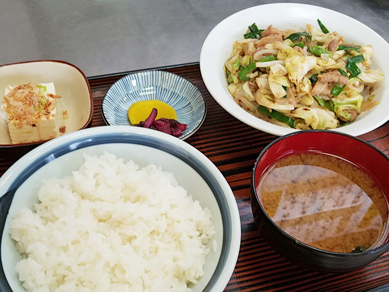 照明を味噌汁に浮かべながら、ホルモン炒め定食の到着です!