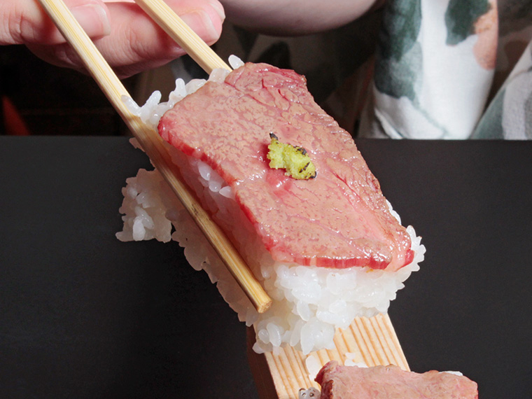 大きな口でほおばって食べると、ワサビで甘みが引き出された和牛と酢飯が最高のカップリングを成していきますよ!ご飯のボリューム的には口の中に高級肉丼が生まれる感じです。
