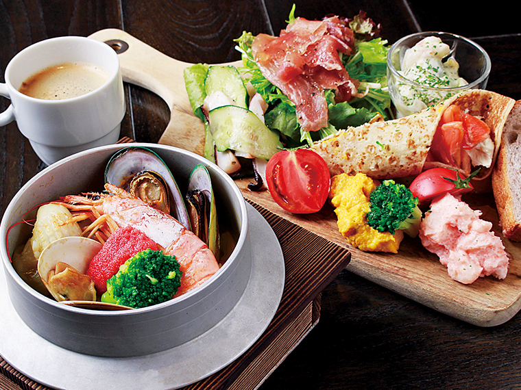 古民家の蔵を再生した、居心地の良い『カフェ 蔵』の店内。ランチセットは、ボリュームがあり、男性にも人気。サラダ、スープ、ドリンクが付く。