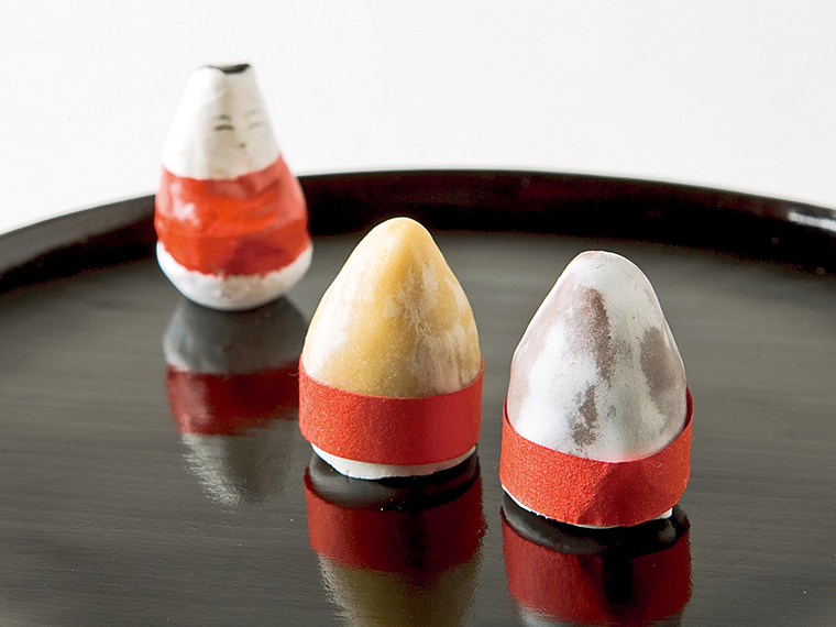 小豆餡と白小豆黄身餡を用いた石衣で雪の情緒を、赤い帯紙をくるりと巻いて小法師らしさを演出。本物の起き上がり小法師1個入り。