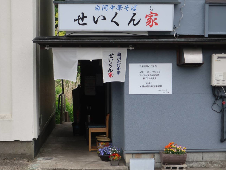 店先には、清潔感が漂う純白の暖簾が揺れる。そこに控えめに刻まれた『白河中華そば せいくん家』の文字が、店主の温和な人柄を物語るかのようだ。そんな11文字の中で、「家」の一文字だけが赤く彩られ、確かな存在感を放つ。