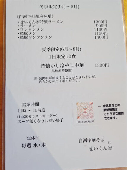 2025年12月現在、提供する麺メニューは、醤油味の「ラーメン」を筆頭に、「胡麻味噌ラーメン」と「塩ラーメン」。そこに、焼豚増し、ワンタン入りといった「白河中華そば」定番のトッピング違いが加わり、想像以上に幅広い構成となっている。