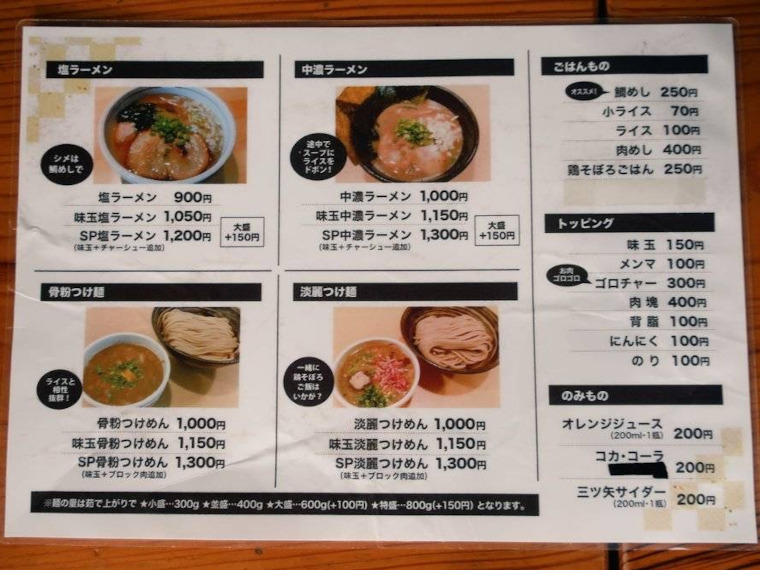 2026年1月現在、提供されているレギュラーの麺メニューは「塩ラーメン」「中濃ラーメン」「骨粉つけめん」「淡麗つけめん」の4種。