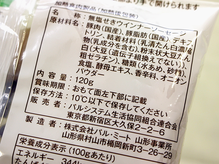 『パルシステム』の商品は、食材にこだわっているのはもちろん、発色剤などの添加物や化学調味料を使っていないの。裏にあるパッケージの品質表示を見てみて!」