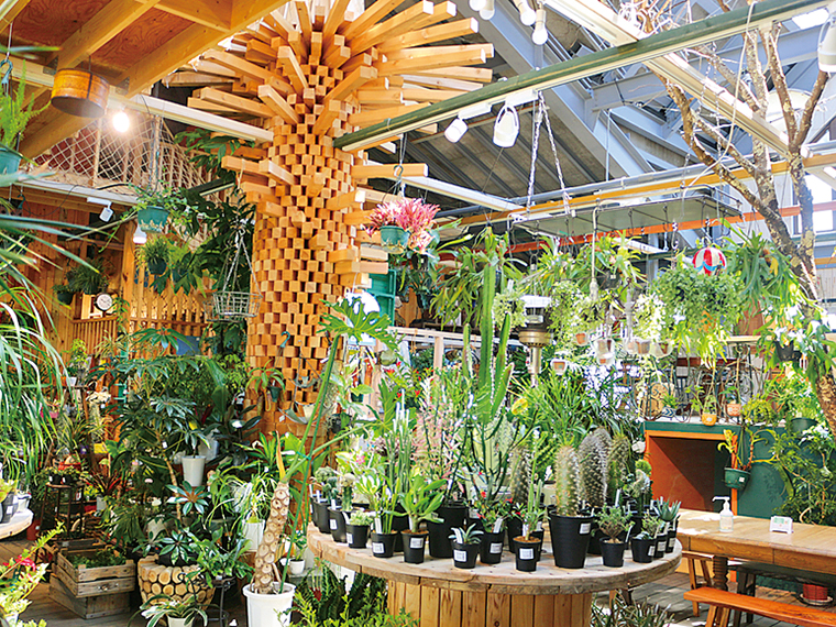 おすすめは手入れが簡単でバリエーション豊かな多肉植物やミニ観葉植物。店内にはカフェスペースもあり、ランチも楽しめる。また、アプリ会員にはお得なクーポンもある。