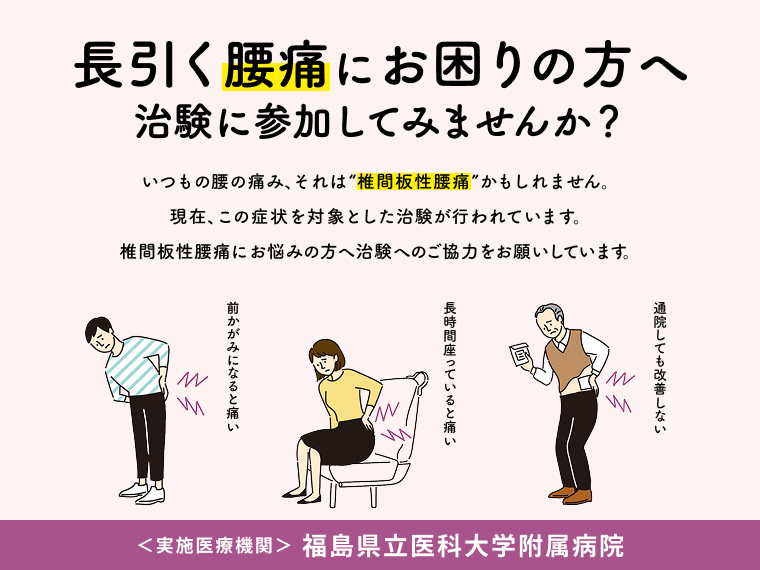 「腰を曲げると痛い」「長時間同じ体勢でいると腰が痛くなる」など、慢性的な腰の痛みを抱えている方を対象に、福島市「福島県立医科大学附属病院」にて椎間板性腰痛の治験を実施しています。