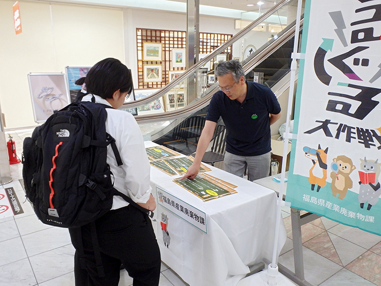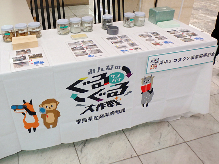 今回は郡山市の産業廃棄物処理業者として、「県中エコタウン事業協同組合」様もブース出展!木や石膏ボードがここまで小さくなるのを見て、驚いている人もいました!