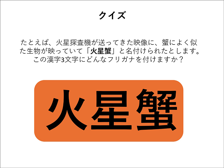 (1)「カニの前に言葉が付くと「蟹」はガニと読まれる(タラバガニやズワイガニ)」、(2)「今回の言葉には「蟹」の前に「火星」という言葉が付いている」