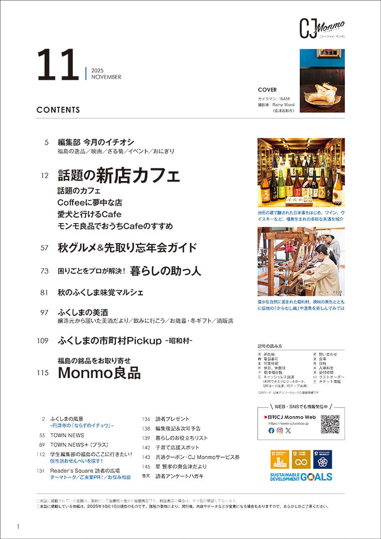 他にも「ふくしまの美酒 再発見」や「秋グルメ&先取り忘年会ガイド」、イベント情報など内容盛りだくさん。「CJ Monmo」11月号のお求めは、福島県内の書店、コンビニ、スーパーなどで。