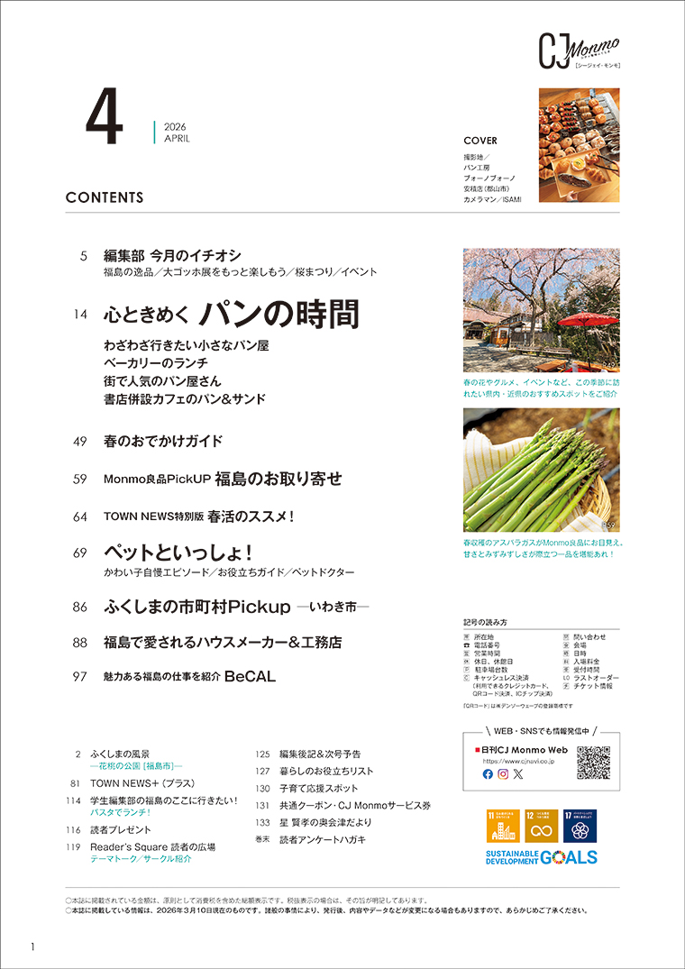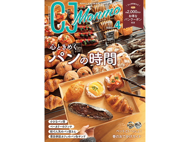 福島県のタウン情報誌「CJ Monmo」4月号は、パン特集!街で人気のパン屋さん、ベーカリーのランチ、わざわざ行きたい小さなパン屋、書店併設カフェのパンやサンドイッチなど、福島県内29店を厳選して紹介しています。
