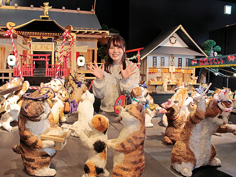 漆器や桐の粉人形などの手作り工芸品を制作・販売する『木之本漆器店』。1階では、職人による美しい漆器や、手描きの蒔絵が施されたグラスなどが並ぶ。2階は入場無料の「桐のこ人形館」。ネコやネズミなど500体以上の表情豊かな人形たちが迎えてくれる。
