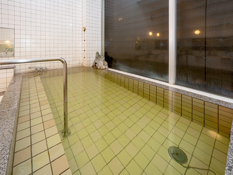 緑がかった湯の泉質は、pH値9.8の「アルカリ性単純温泉」。強アルカリ性に近い湯の特徴は、とろりとしていて肌にまとわりつくような感触があります。湯温はぬるめなので、長湯でゆったりと日頃の疲れを癒やすのがおすすめ。