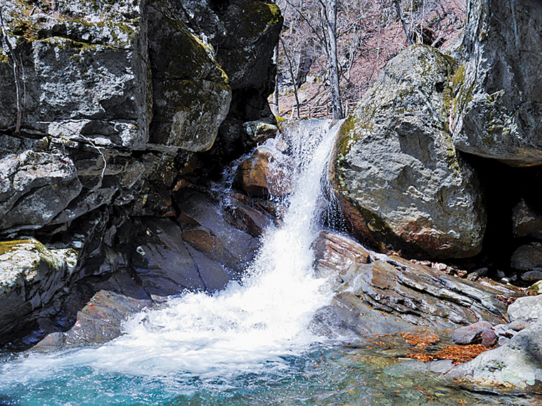 駐車場から遊歩道を30分ほど歩いたところにあり、大岩の間から勢い良く噴き出す様子は圧巻。下流にある扇形の「三日月の滝」も必見だ。