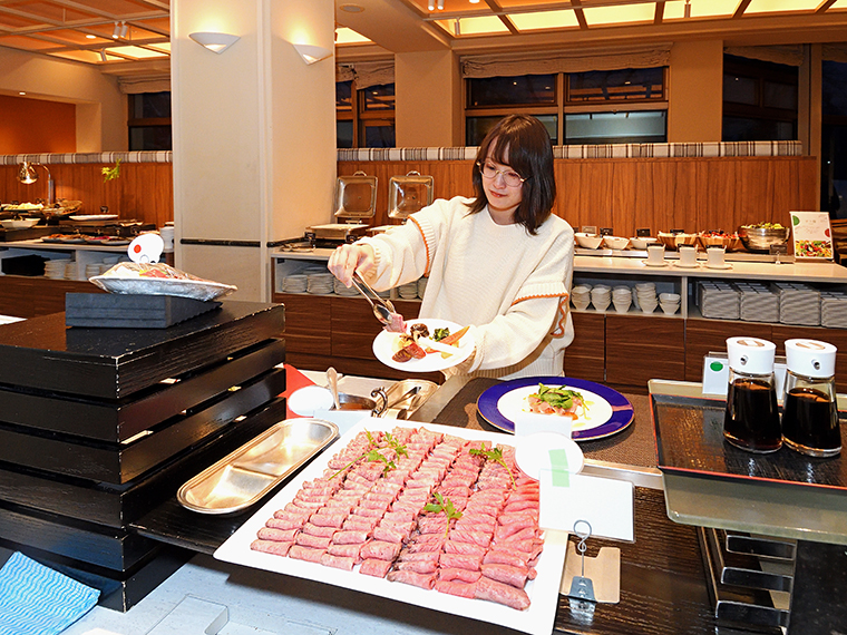 夕食会場の「THE MOUNTAIN DINING」に向かうと、福島県産食材をふんだんに使った料理がずらり。人気の福島県産和牛のローストビーフをはじめ、季節野菜のサラダ、スペアリブなどの和洋様々な料理、さらにそばやスイーツまで、約50種類のメニューをビュッフェスタイルで味わえます。