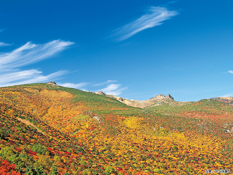 標高1,700mの『安達太良山』は日本百名山の一つで、多くの登山客が訪れる人気の山。中腹からロープウェイを利用すれば、標高1,350mの薬師岳までわずか10分。斜面一面に広がる紅葉の絨毯を目の当たりにできる。