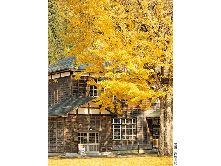 旧小学校を活用した、昭和村の交流・観光拠点施設『喰丸小(くいまるしょう)』。木造校舎の前にそびえる樹齢120年を超える大イチョウがシンボルだ。落葉するまでの間、大イチョウと校舎のライトアップが行われる。