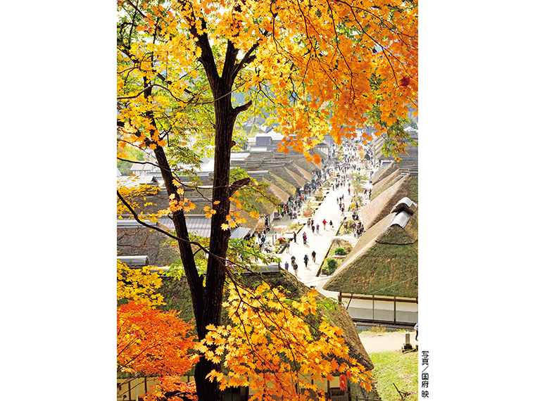 江戸時代に宿場町として栄え、当時の景観を今に伝える下郷町の人気スポット『大内宿』。周辺の山々の燃えるような紅葉と、伝統の茅葺き屋根や田んぼなどが織りなす日本の原風景を堪能できる。