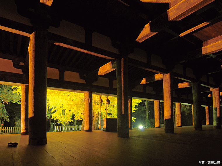 平安時代の寝殿造りの流れをくんだ吹き抜けの拝殿「長床」の目の前に佇む、樹齢850年を超える喜多方市の『新宮(しんぐう)熊野神社』の大イチョウ。見頃の時期はライトアップも行われ、吹き抜けの拝殿から幻想的な姿を眺めることができる。
